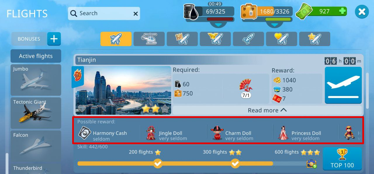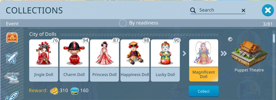 ▶ Send planes to event destinations to get items for the City of Dolls collection (very seldom) and Harmony Cash