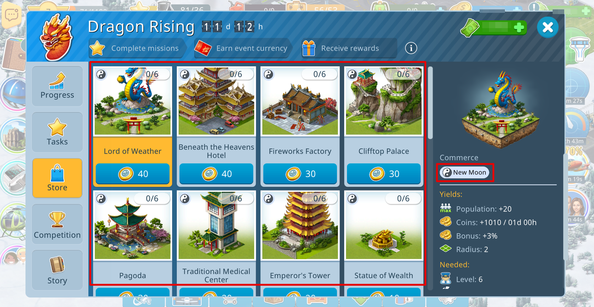 Build a unique building that will become the centerpiece of your New Moon block. The Dragon Square increases the profits of all New Moon buildings (buildings with a New Moon tag